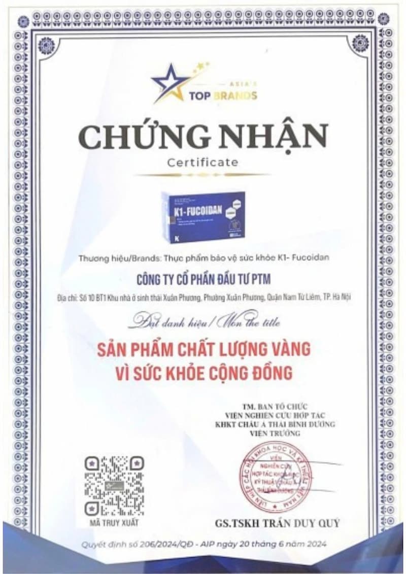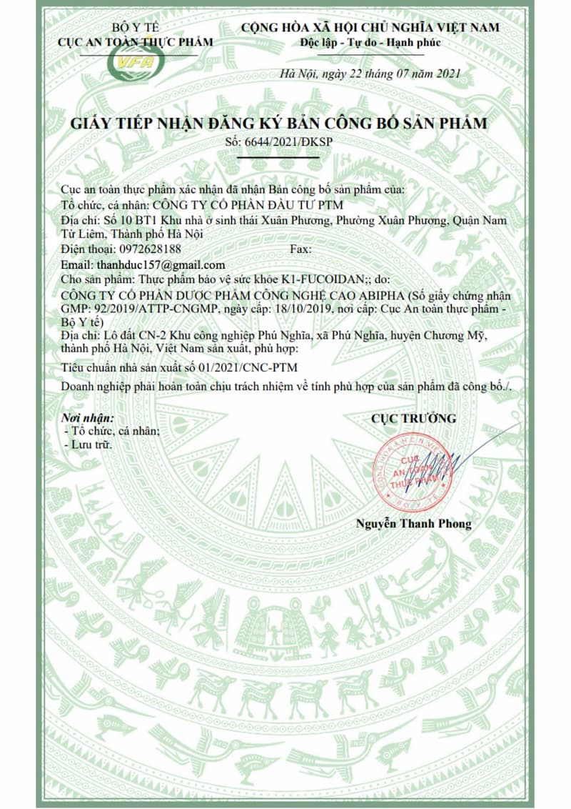 Giấy tiếp nhận đăng ký bản công bố sản phẩm từ Bộ Y Tế – Cục An toàn thực phẩm là một chứng nhận quan trọng, xác nhận rằng K1Fucoidan đã đáp ứng đầy đủ các tiêu chuẩn an toàn và chất lượng theo quy định của pháp luật. Đây là minh chứng cho sự nghiêm túc và cam kết của Công ty Cổ phần Đầu tư PTM trong việc đảm bảo sản phẩm an toàn và hiệu quả cho người tiêu dùng.